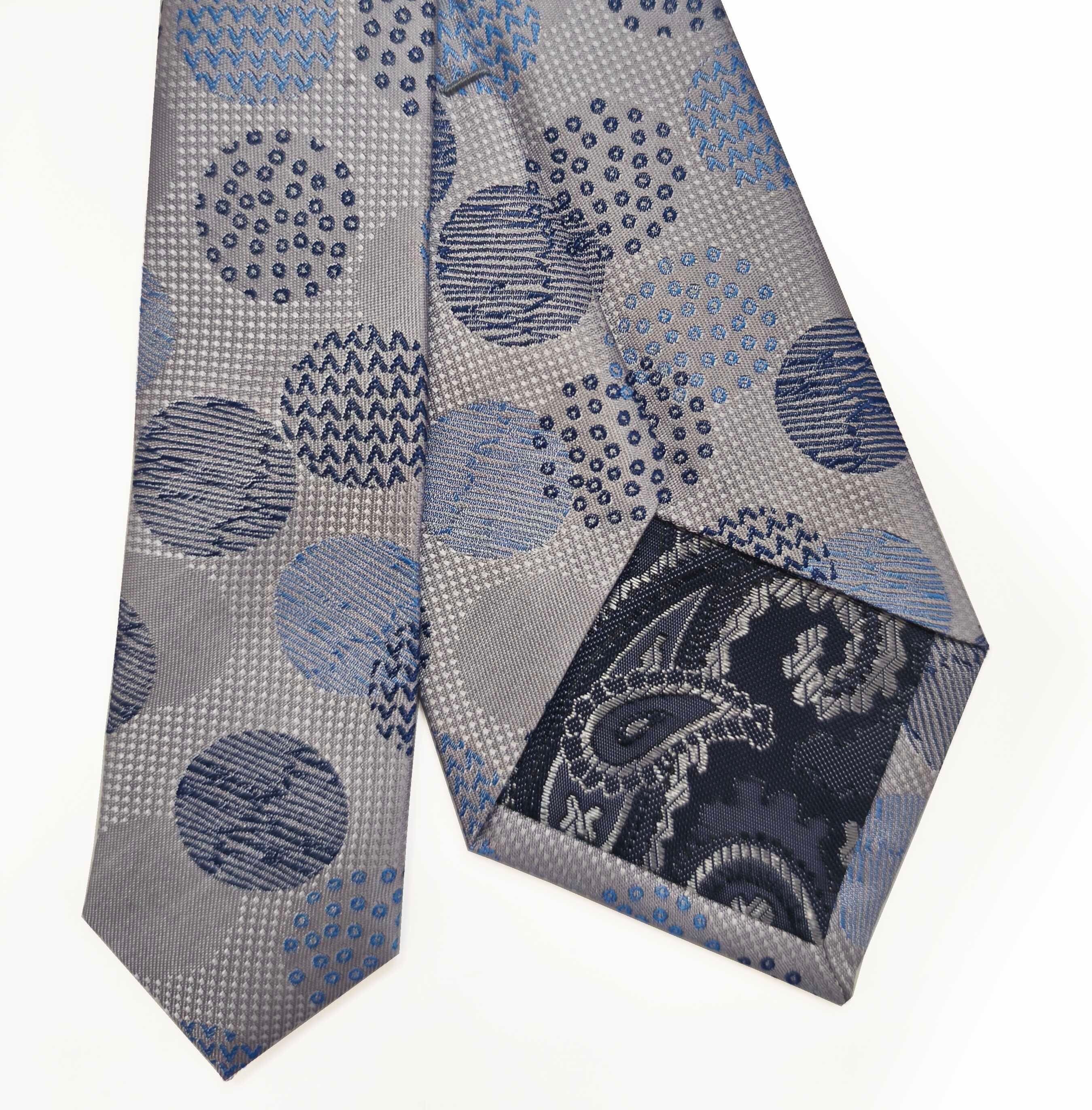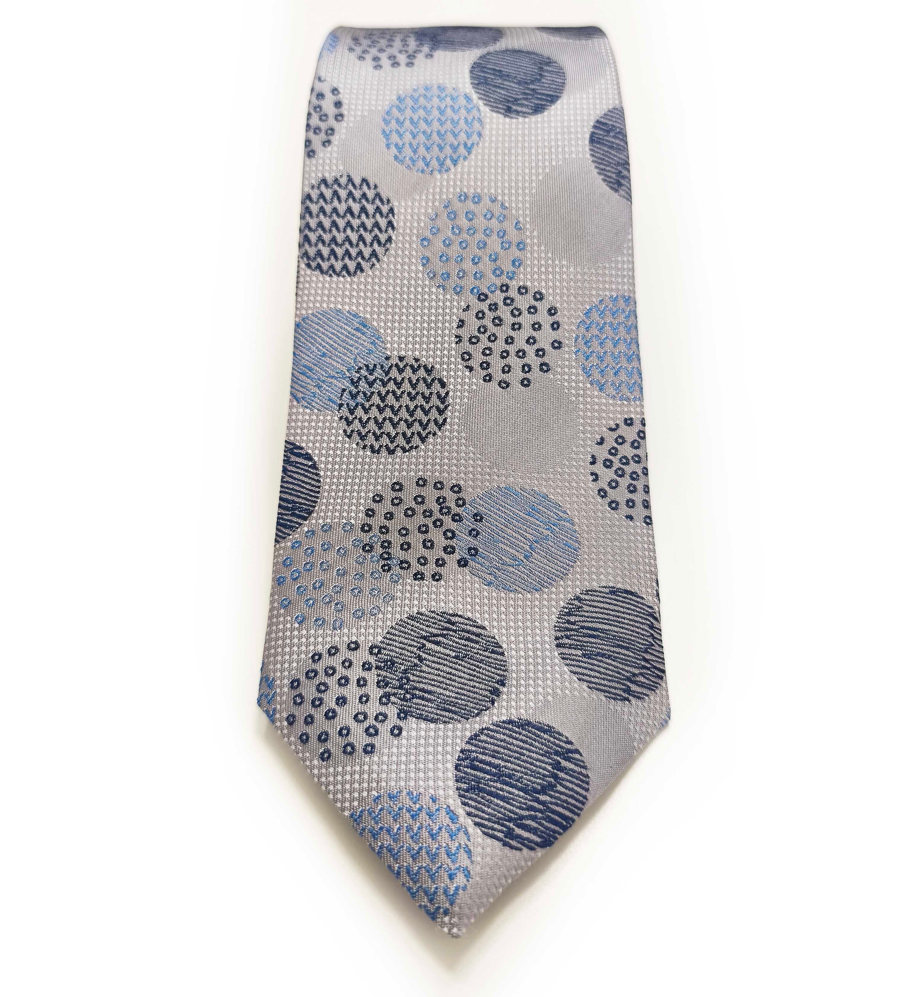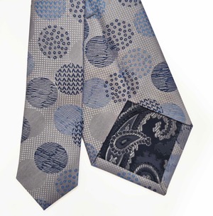 こちらのXOOGの新作ネクタイは、明るいシルバーを基調に、手描き風のネイビーとセルリアンブルーのドットが自由に散りばめられたデザインが特徴です。