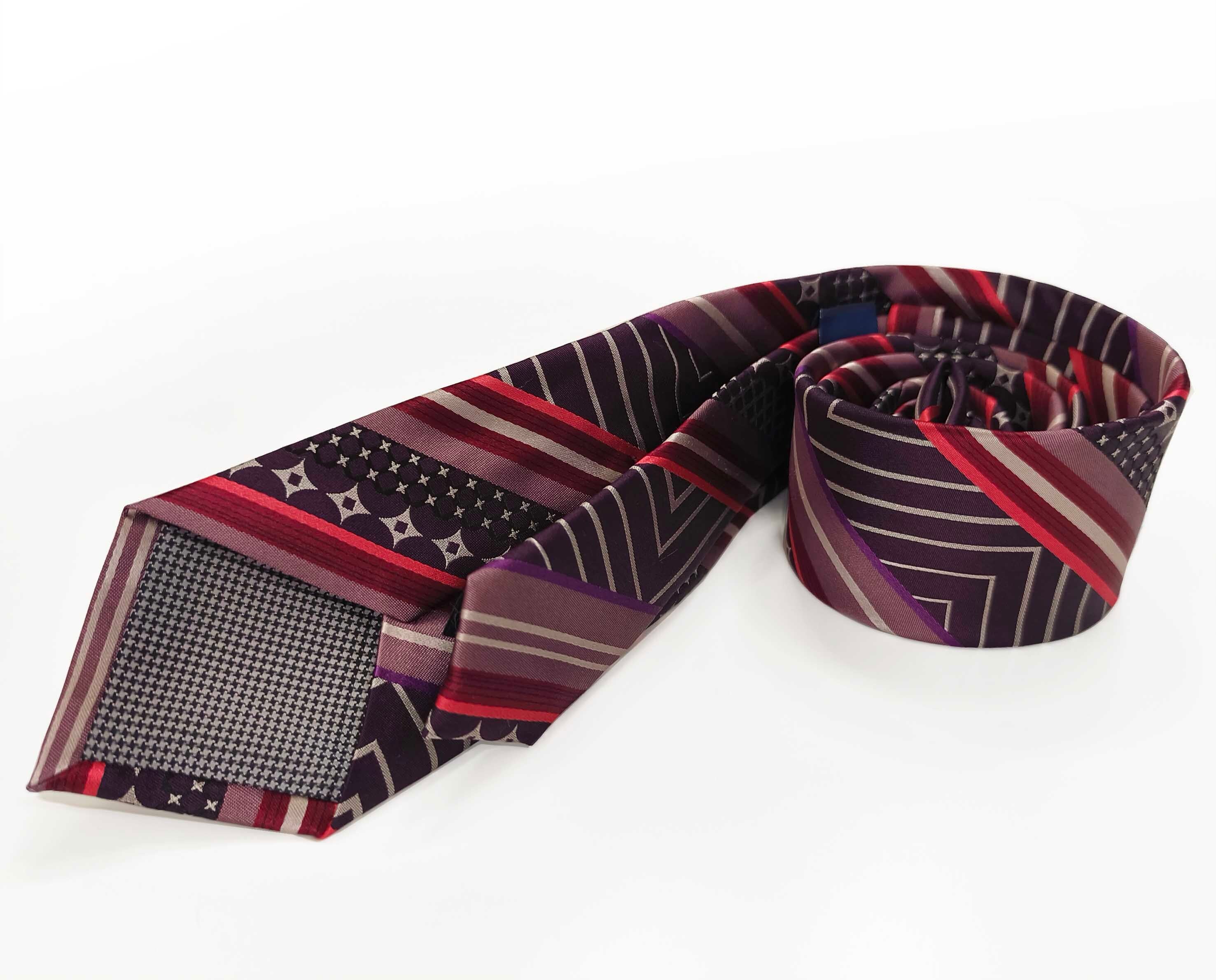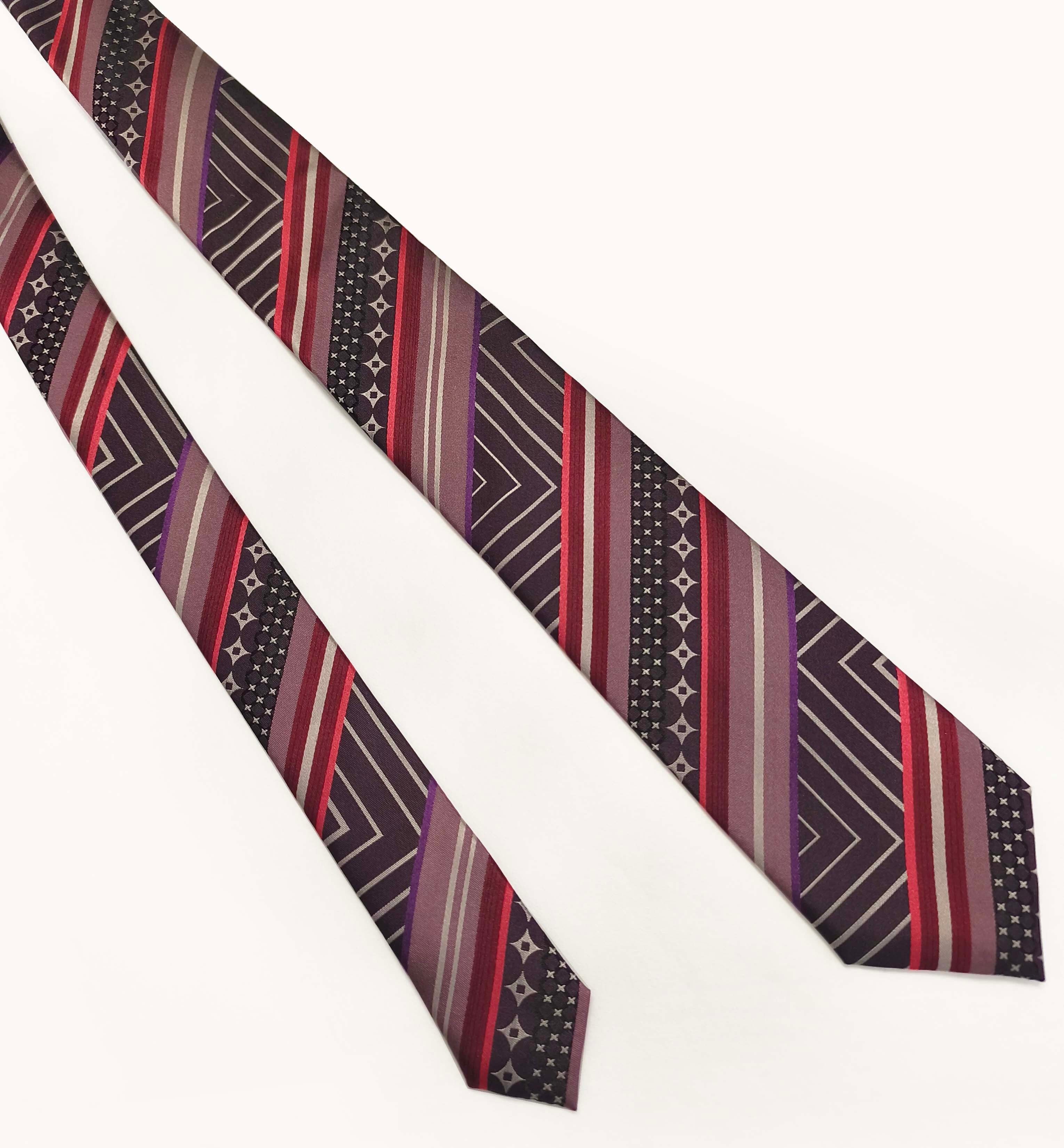 深みのあるダークワインをベースに、ストライプと幾何学模様が大胆に交差する、唯一無二のデザイン。