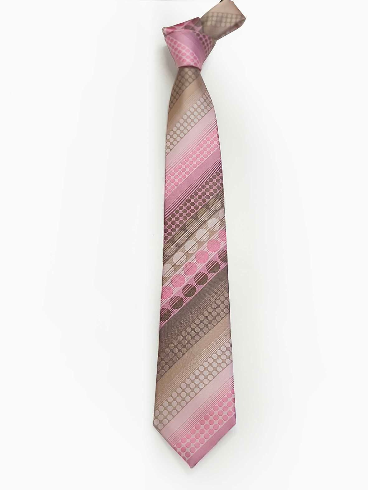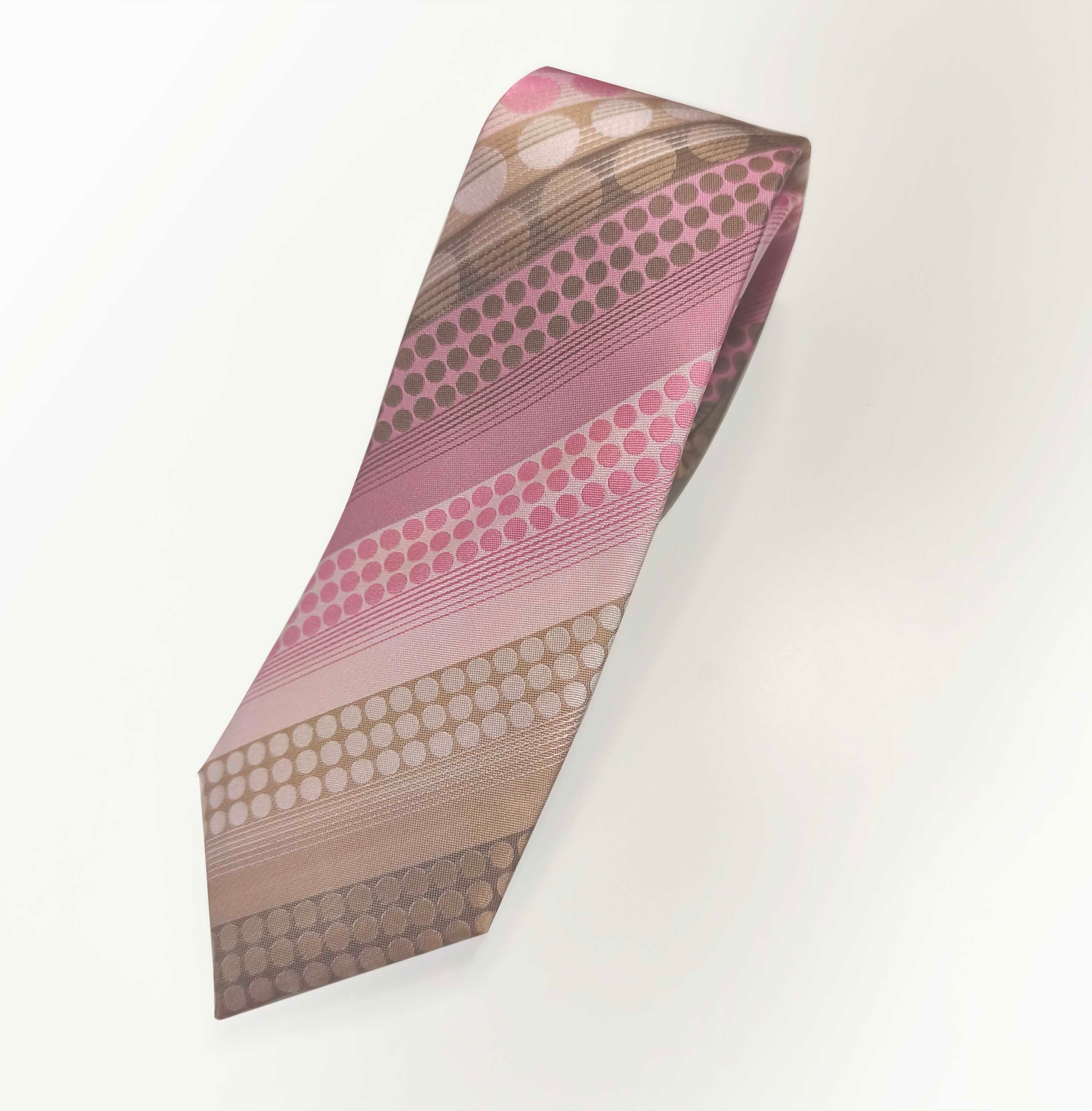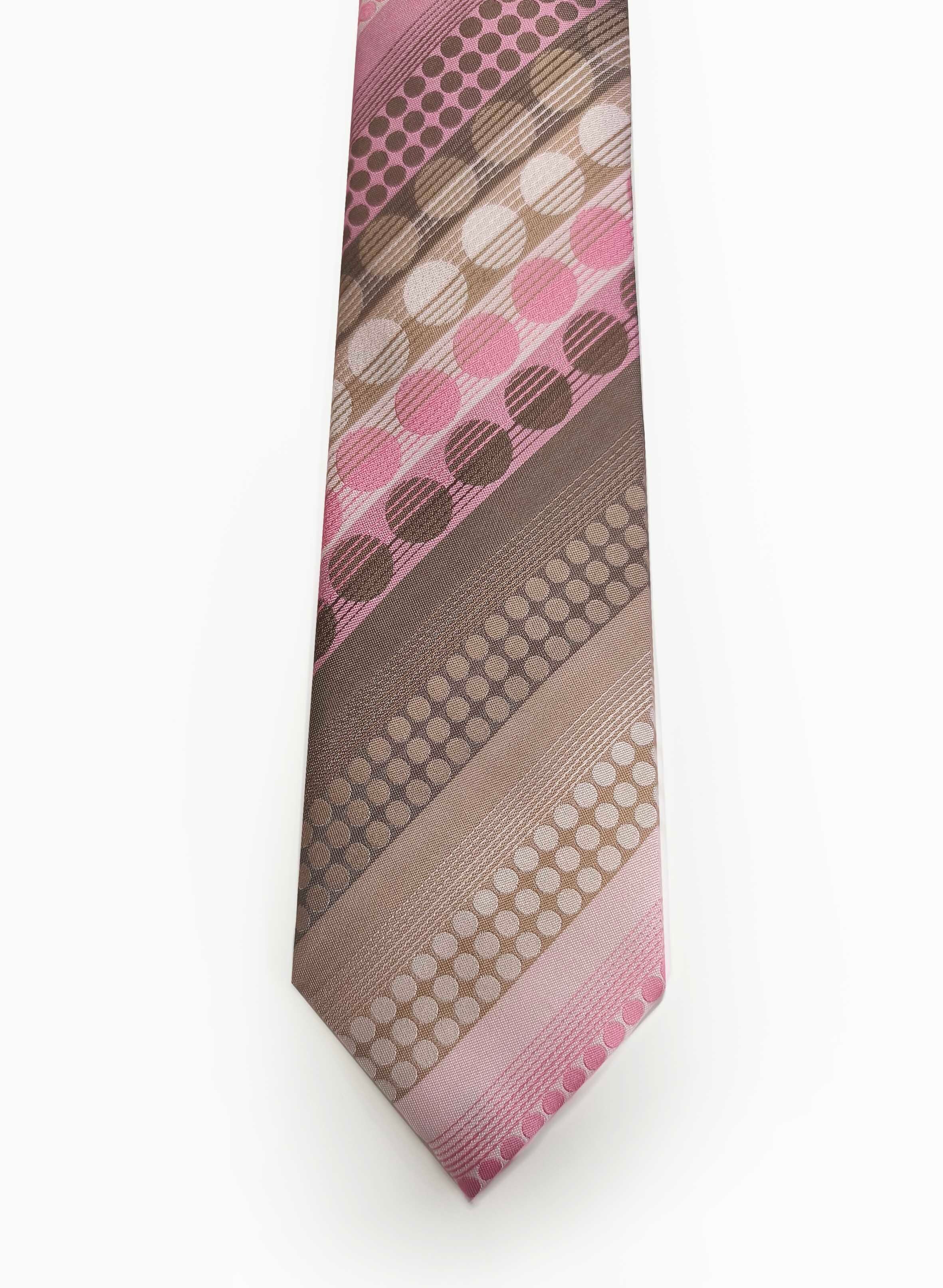サークル、ドット、ストライプの模様が、ローズピンク、薄いベージュピンク、トープ、ブラウンの色彩のグラデーションと相まって描かれたポップなデザインです。
