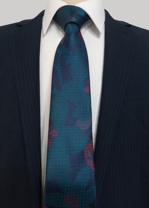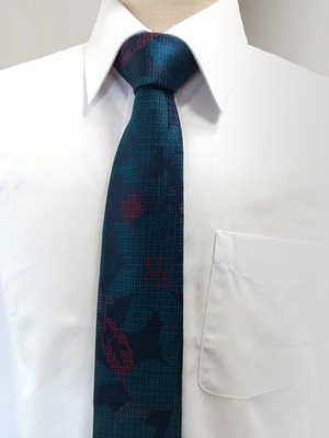 本品は兼ねてから作りたいと思っていた、花柄のネクタイを幾何学模様に絡めた野心作です。